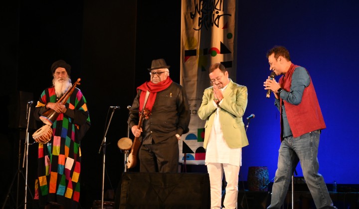 The programme opened with the powerful voice of Mansur Fakir singing, “Nitai Gour Premanande, ekbar Hari bolo.” The hall fell silent almost instantly. There was something deeply moving about hearing a Muslim fakir invoke Nitai and Gour with such devotion. It was a reminder of Bengal’s long tradition of spiritual coexistence, where faith does not divide but connects. In that moment, the song felt larger than music—it became a statement.